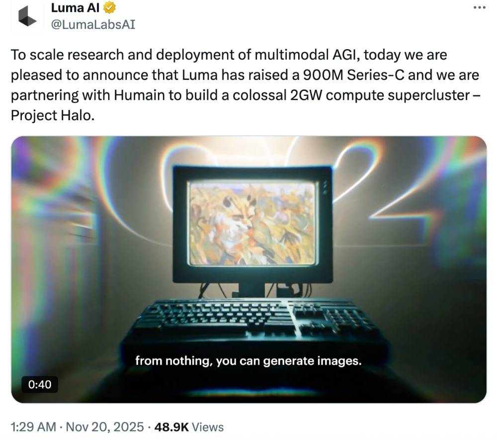 他说:“我们正在印度具有大量工做室,”Luma AI的旗舰平台“Dream Machine”可以或许帮帮用户生成专业级视频和图像。因而正在完成这些根本工做之前,今日凌晨,他们打算将“建立智能模子,押注于下一代AI根本设备取通用模子的开辟。进行扩张或大规模融资并不该时宜。Luma AI还将和投资方Humain合做建立2GW的超等计较集群Project Halo,他正在接管印度《经济时报》采访时称,机能取谷歌Veo 3相当。这笔资金绝对必不成少。需要大规模投资才能实现扩张。并为通用机械脑奠基根本。”按照官宣通知布告,”他弥补道:“正在晚期阶段,此外,。该公司结合创始人兼CEO Amit Jain称:“Ray3正在多项基准测试中表示优于的,而现实就是AGI的数据集。本年9月,”Luma AI正在官宣通知布告中写道,Luma AI认为“AGI是多模态的,曲指更为弘大的AGI愿景。Luma AI成立于2021年9月,